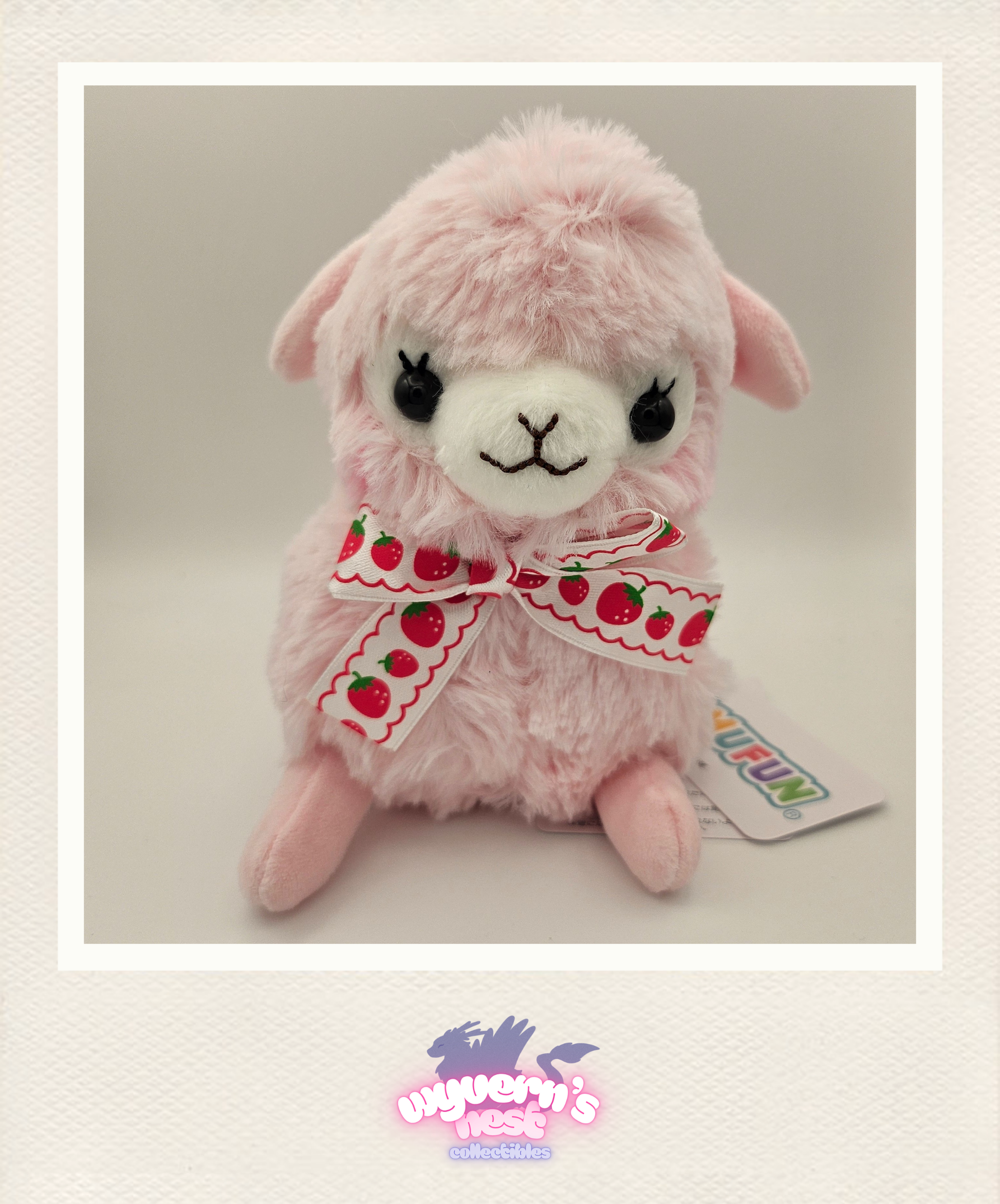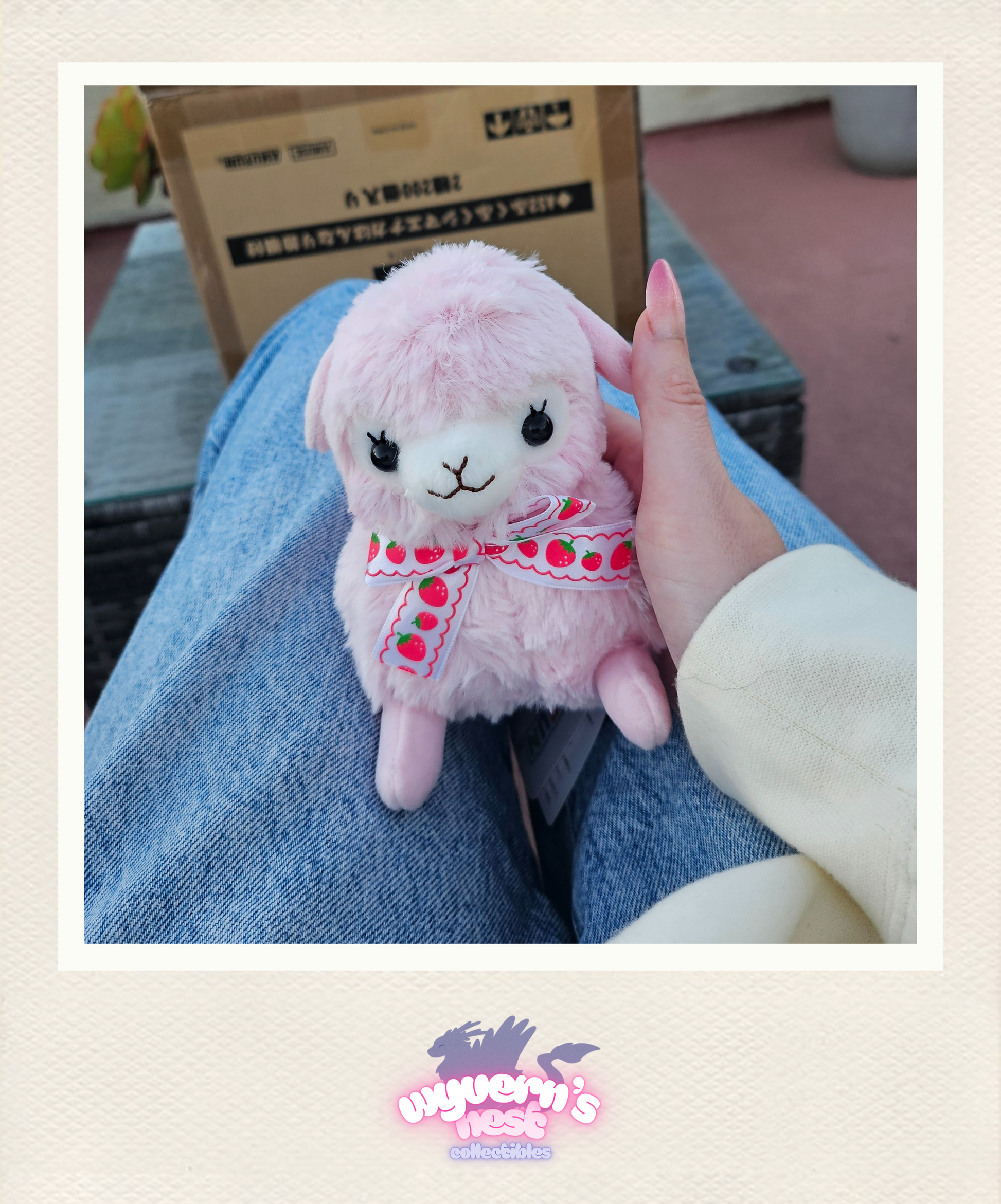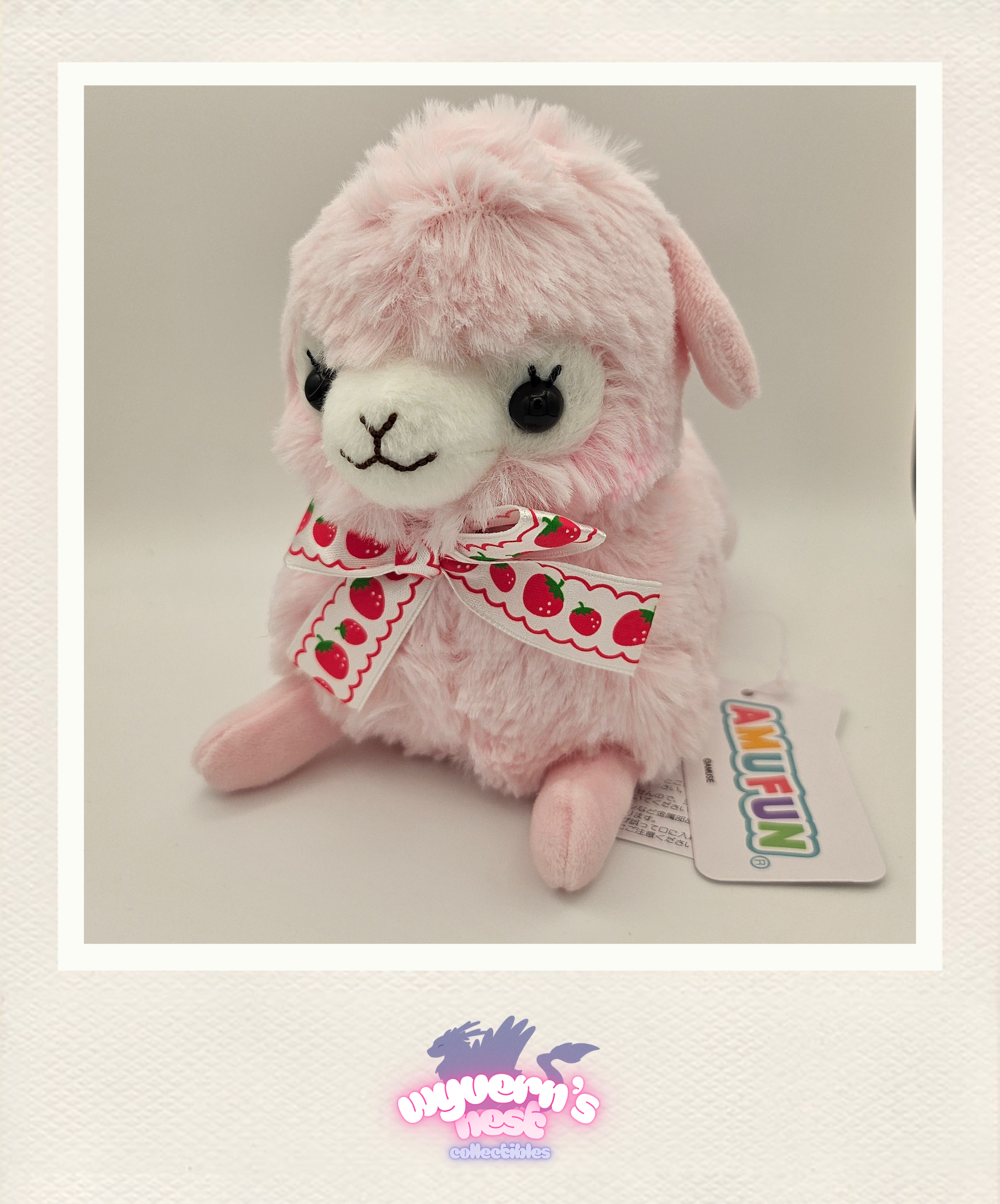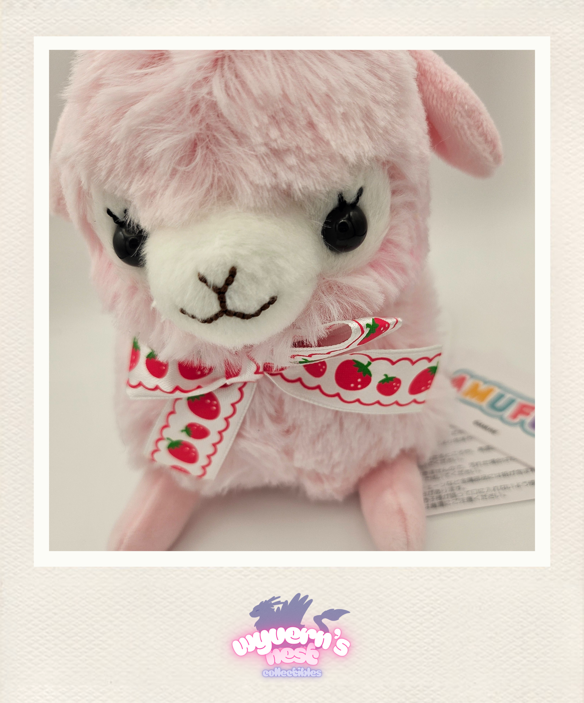 These AMUSE brand Alpacasso plush are amazing travel companions! They are incredibly soft and squishy, with adorable little eyes and a cute strawberry bow.